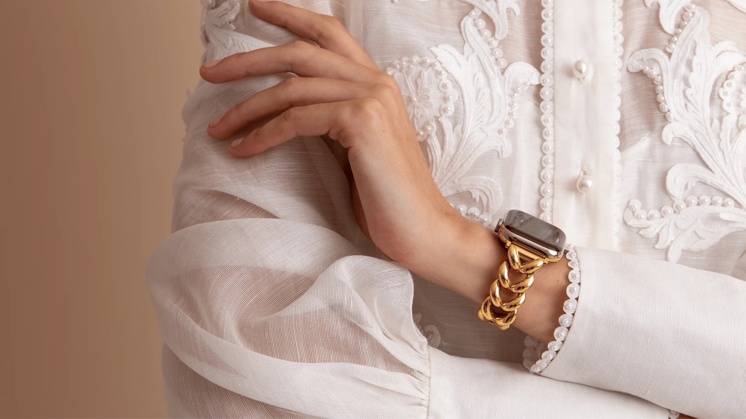 Strap For Watch keeps your Apple Watch comfortable and secure all day. Skin-friendly, PFAS- and nickel-free materials prevent irritation, while heart rate, sleep and activity stay within easy reach. Care for your health without compromising on timeless style.